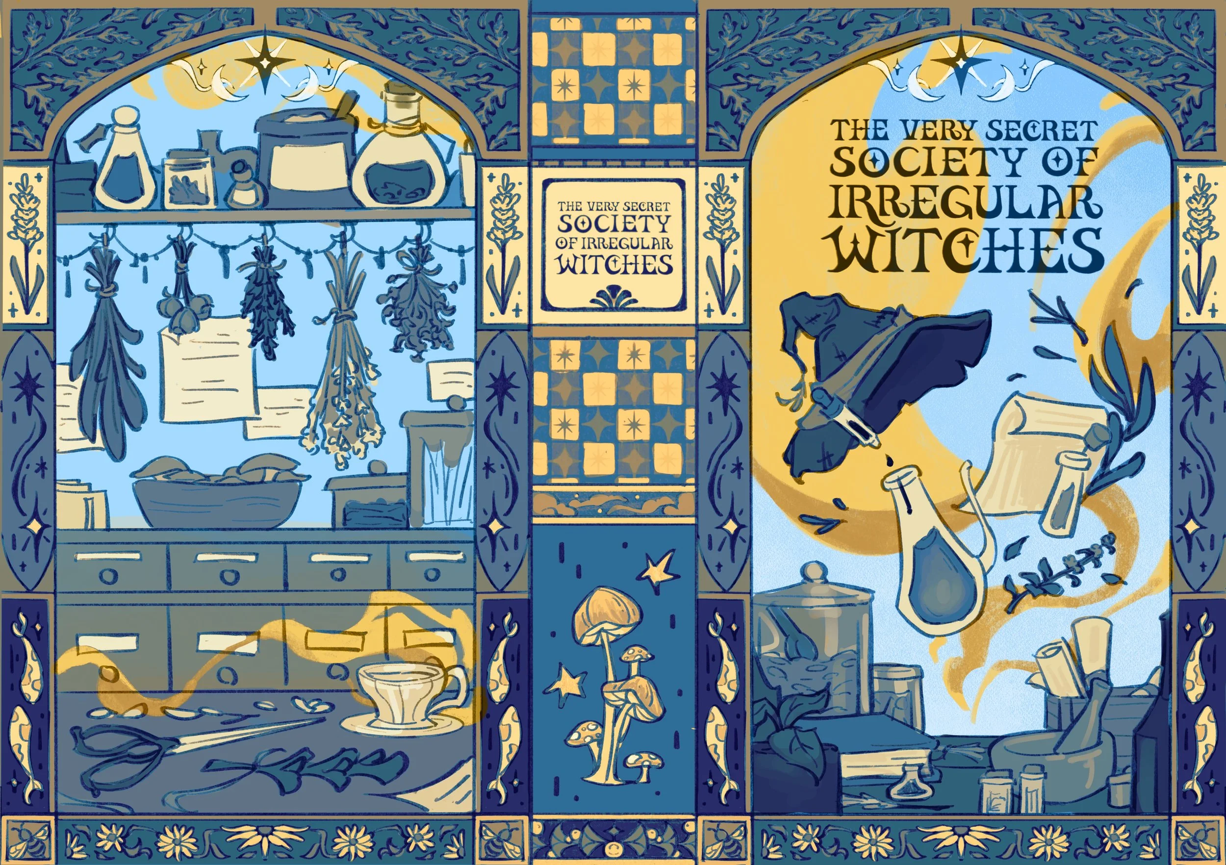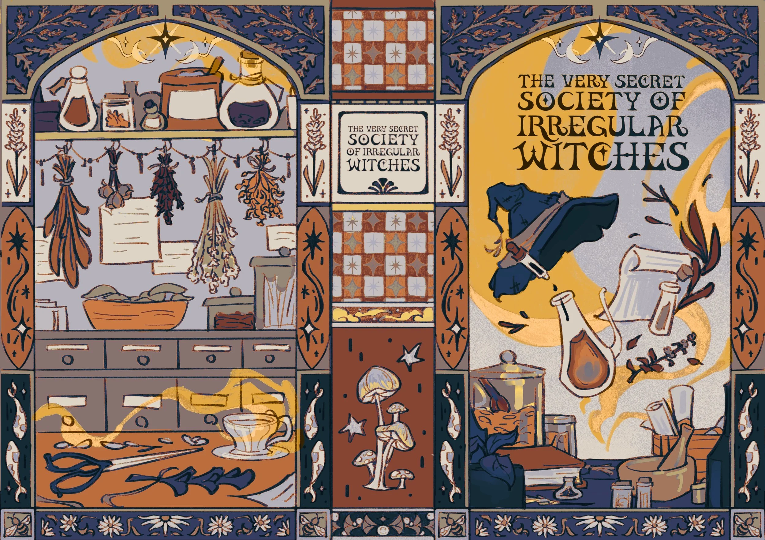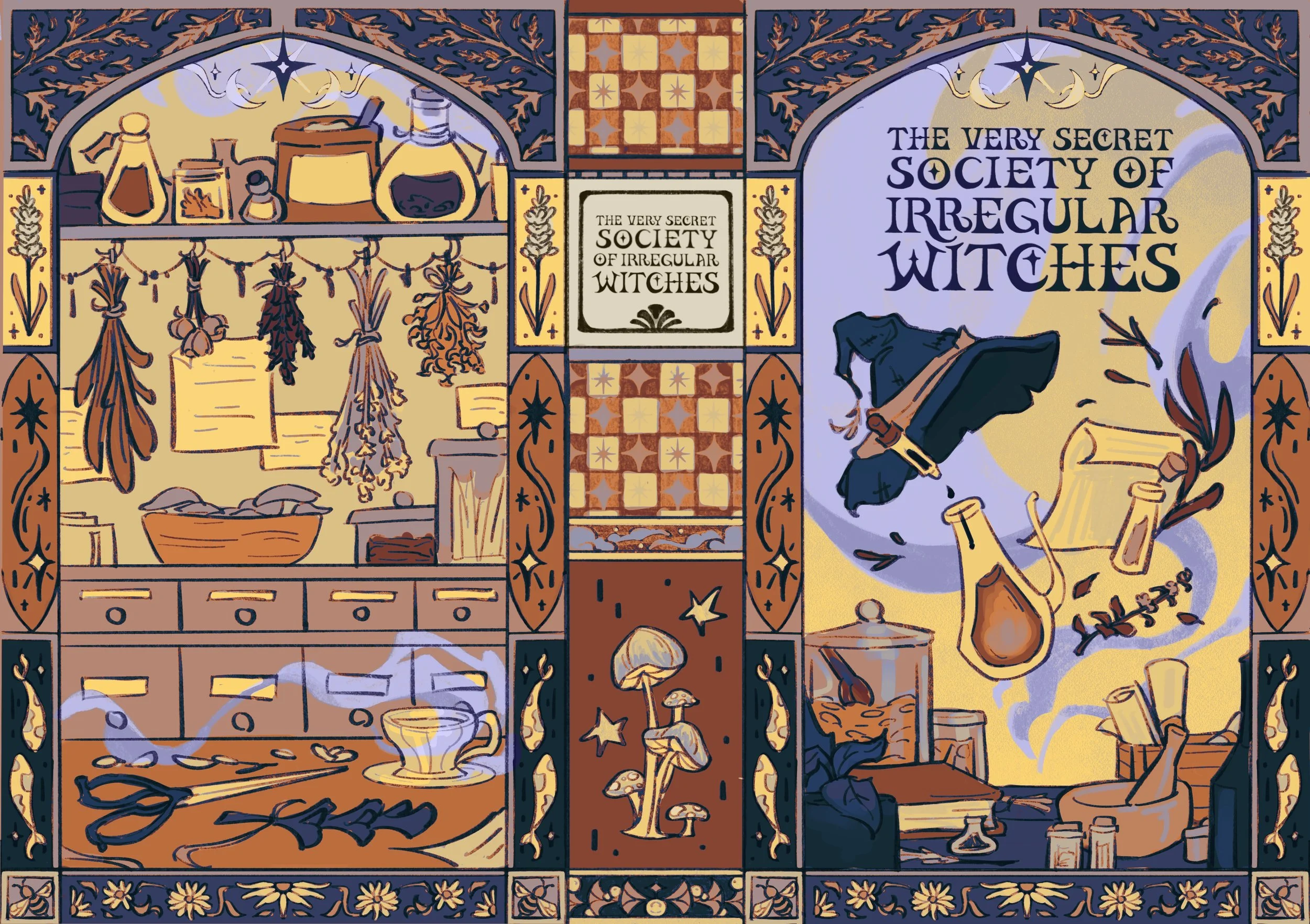 Illustrated the special edition case covers for both companion books: The Very Secret Society of Irregular Witches and A Witch’s Guide to Magical Inn-keeping by Sangu Mandanna.